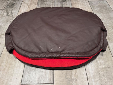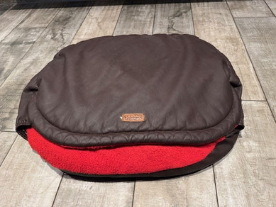 Größe M, Kunstleder dunkelbraun KL 066, innen rote Teddylocke TL 05 Rot, hier ist leider oben das Etikett abgefallen